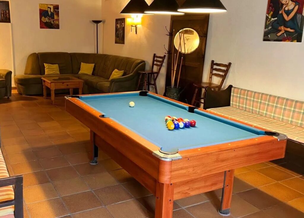 Unsere traditionelle katalanische Masia / Finca verbindet historischen Charme mit modernem Komfort und bietet die perfekte Umgebung für Erholung und Abenteuer gleichermaßen. Die dicken Lehmwände sorgen selbst an heißen Sommertagen für ein angenehm kühles Raumklima, während der weitläufige Garten mit seinen schattigen Sitzbereichen, Hängematten und einem großen Schwimmbecken zum Entspannen einlädt. In den großzügigen Gemeinschaftsräumen könnt Ihr gesellige Abende verbringen oder Euch bei einer Partie Billard oder Tischtennis herausfordern.